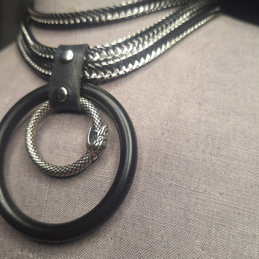 The Python. Flat Franco, gunmetal chain with 2" black O-ring and brushed silver Ouroboro. The chain wraps around the neck through the leather connector and can be worn several ways. Handmade.