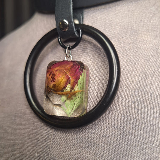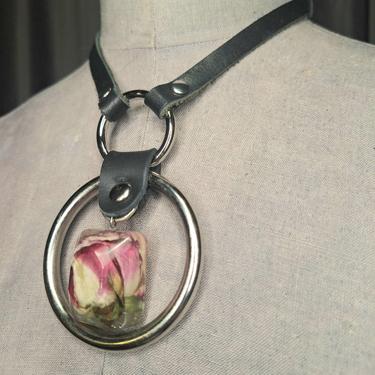 Jewel shaped rosebud pendant with a 2" black steel O-ring, statement necklace. Handmade. High end gothic style. Edgy victorian.