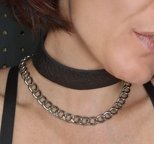 The Joannie. A black leather and silver curb chain, layered necklace. Handmade.