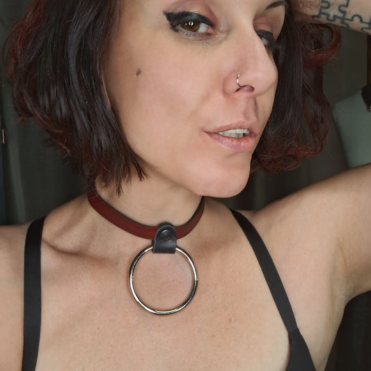 The Chome Ruby. Ruby Red Leather Collar. 2" silver O-ring, solid brass. Black buckle closure. Handmade.