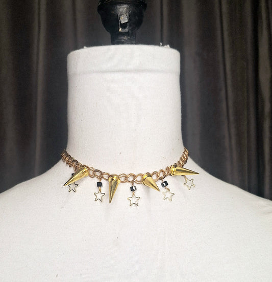 Golden Star. A celestial spiked necklace for the sophisticated punk. Subtle gold stars and jet beads. Adjustable chain closure.