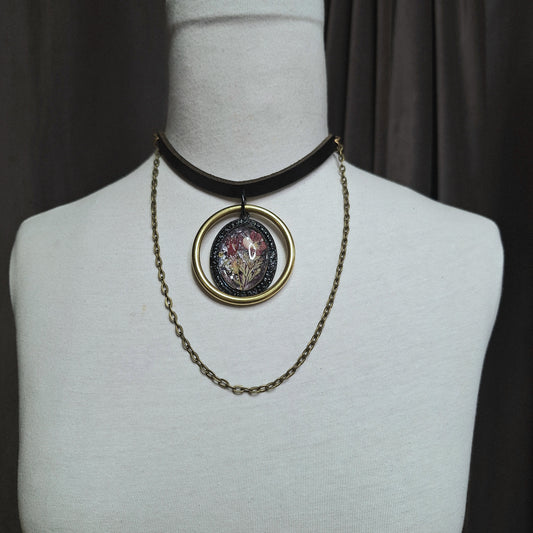 Season of the Witch, Double Oring Choker with Dried Pressed Flowers Adornment Centerpiece.
