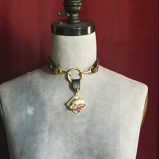 The Empress. Handmade Leather Choker with Black Steel Oring and Teardrop Labradorite Gemstone Centerpiece. High-quality.