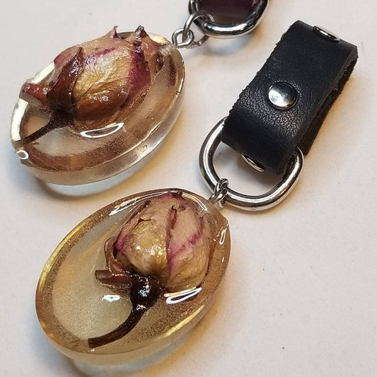 The Deadly Rose. Chic leather Oring necklace with a single pink dried rosebud in a resin heart pendant.