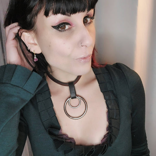 Chic Stone, Steel, & Silver oring collar. Black slender leather, 2" silver oring, & faceted Ruby teardrop.