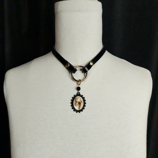 Coyote Tooth Cameo with gold finish necklace. Slender black leather riveted to 1" gold plated O-Ring. Handmade.