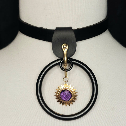 Amethyst Sunburst statement necklace. Black leather, black O-ring. Handmade.