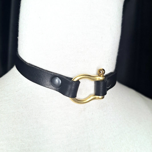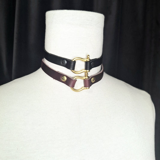 Love Shackles leather choker. Handmade. Solid brass shackle pin and buckle closure. Available in black and purple leather.