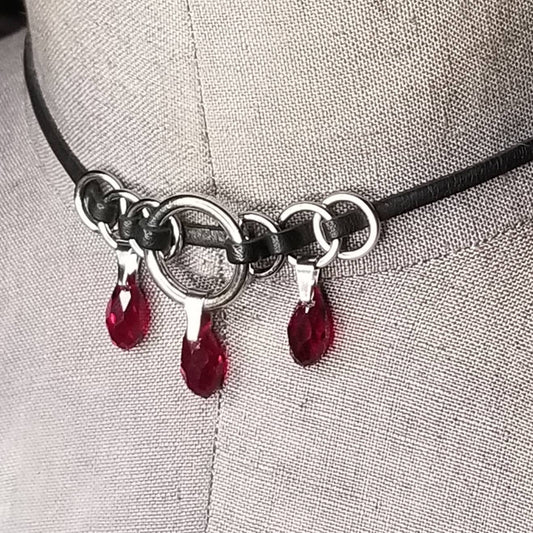The Delena, red crystal teardrop, and black leather ribbon necklace. Leather is handwoven through silver orings with red teardrops.
