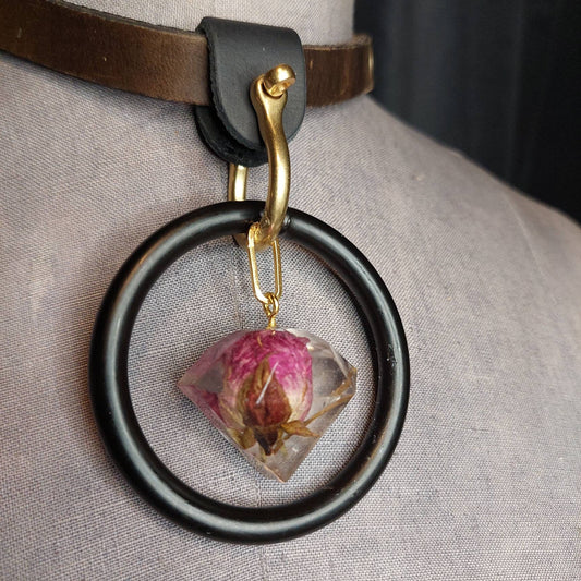 The Claire Leather Collar with a Real Pink Rosebud Jewel Pendant. Black steel Oring and Gold Shackle Pin.