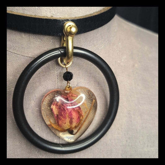 The Deadly Rose. Chic leather Oring necklace with a single pink dried rosebud in a resin heart pendant.