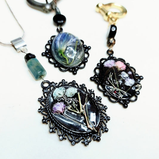 Jewel shaped, real purple flower pendant with silver bail. Handmade, one-of-a-kind. Nature encased in a necklace.