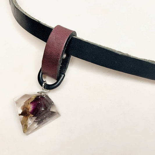 The Claire Leather Collar with a Real Pink Rosebud Jewel Pendant. Black steel Oring and Gold Shackle Pin.