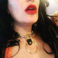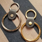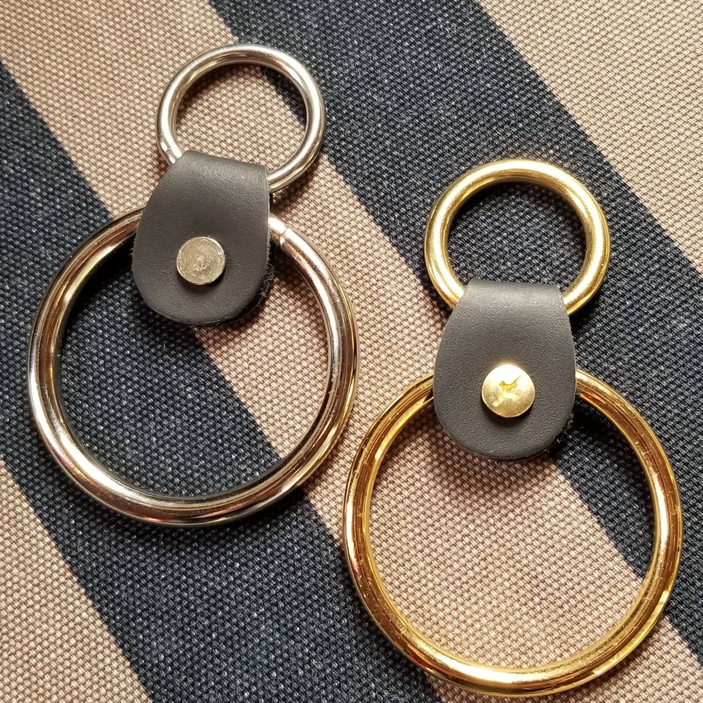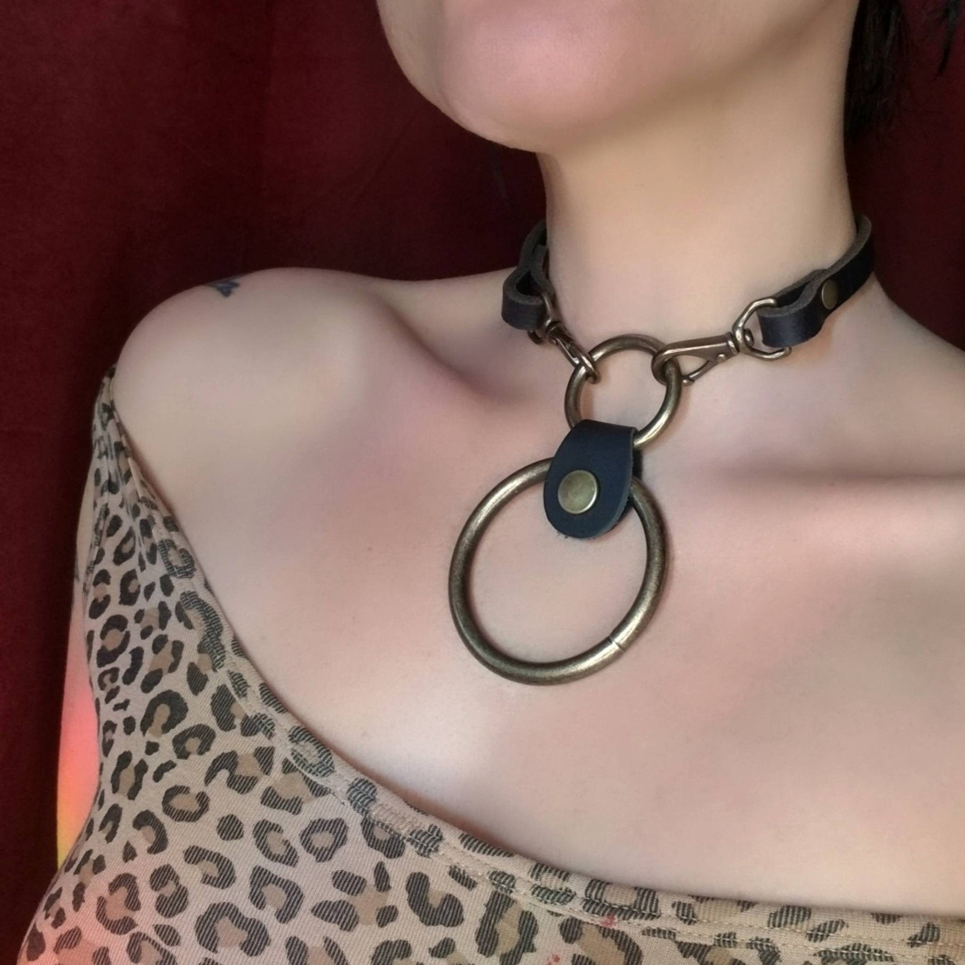 Antique finish O-rings made of solid brass. Black leather connector with rivets. 1" and 2" O-rings snap to a chic, slender leather collar.