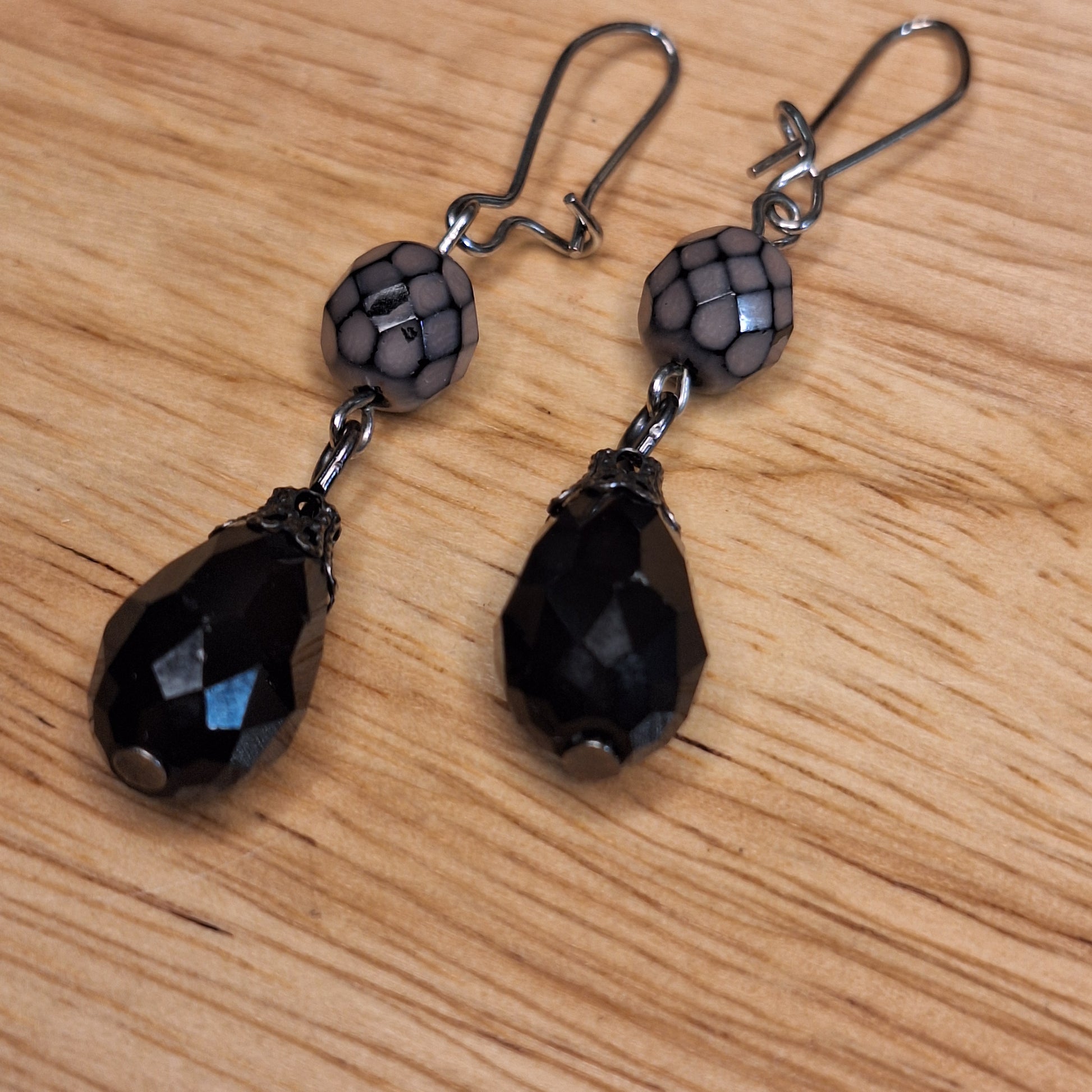 Black crystal teardrop and lavender faceted glass drop earrings. Silver hook closure.