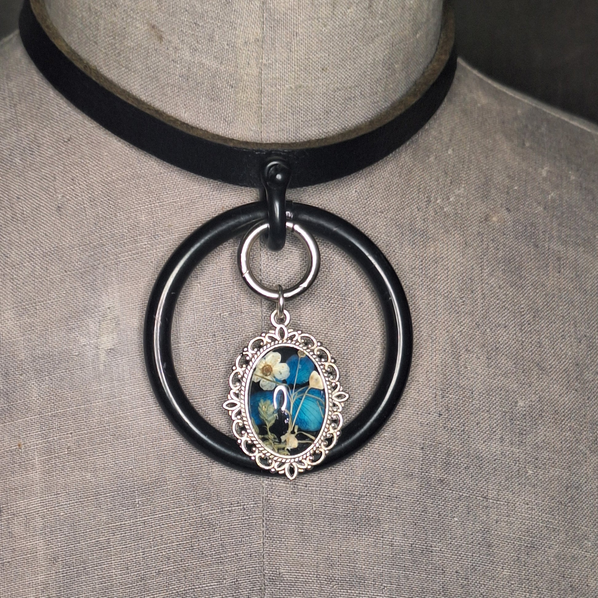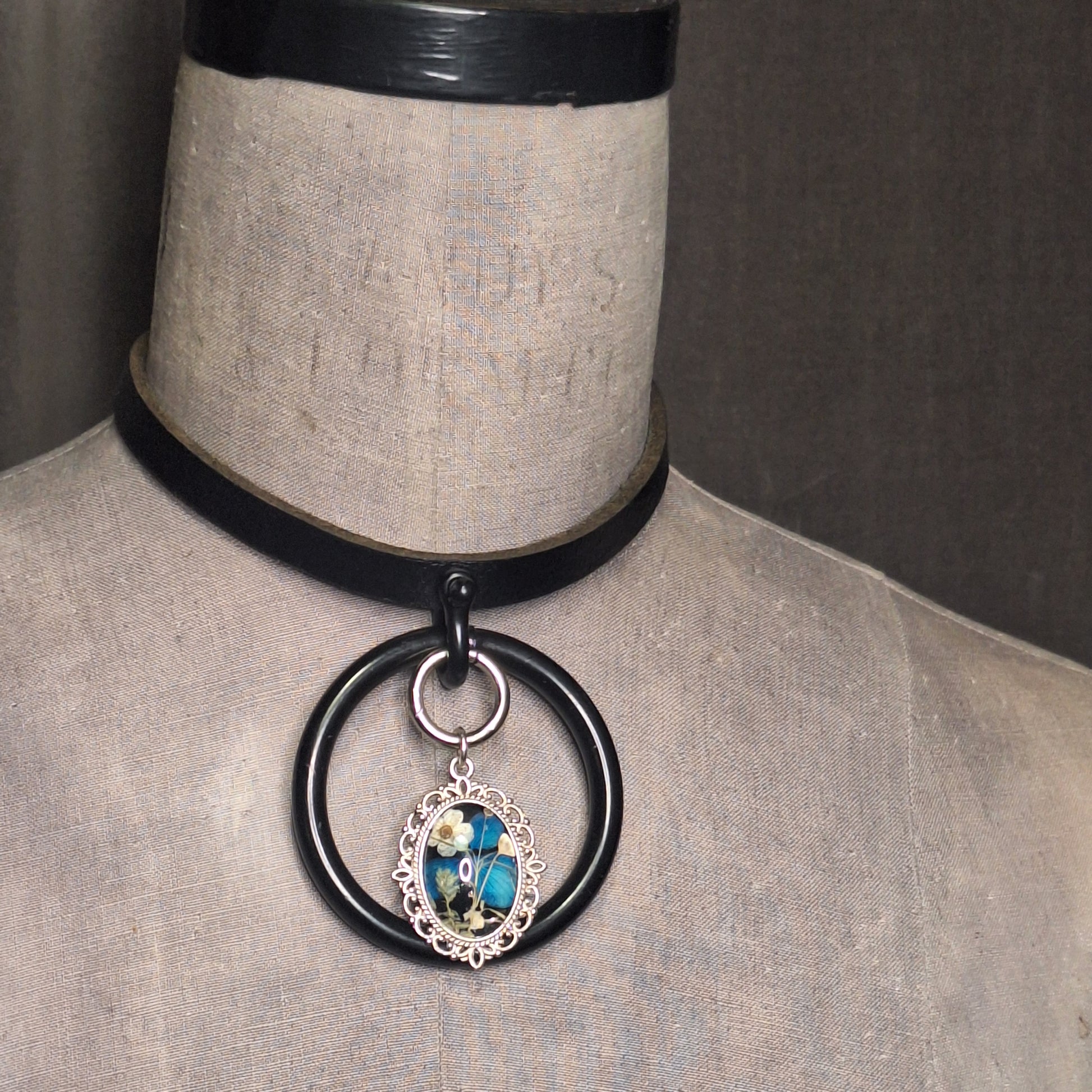 One-of-a-kind, handmade chic black leather choker with a 2" steel oring and a pressed blue flower cameo pendant, suspended with a black shackle pin.