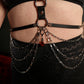 Black leather upper body harness with solid brass, 1" O-rings in silver finish. Chain draped to fall on hips. Red ruby crystal detail at waistline.