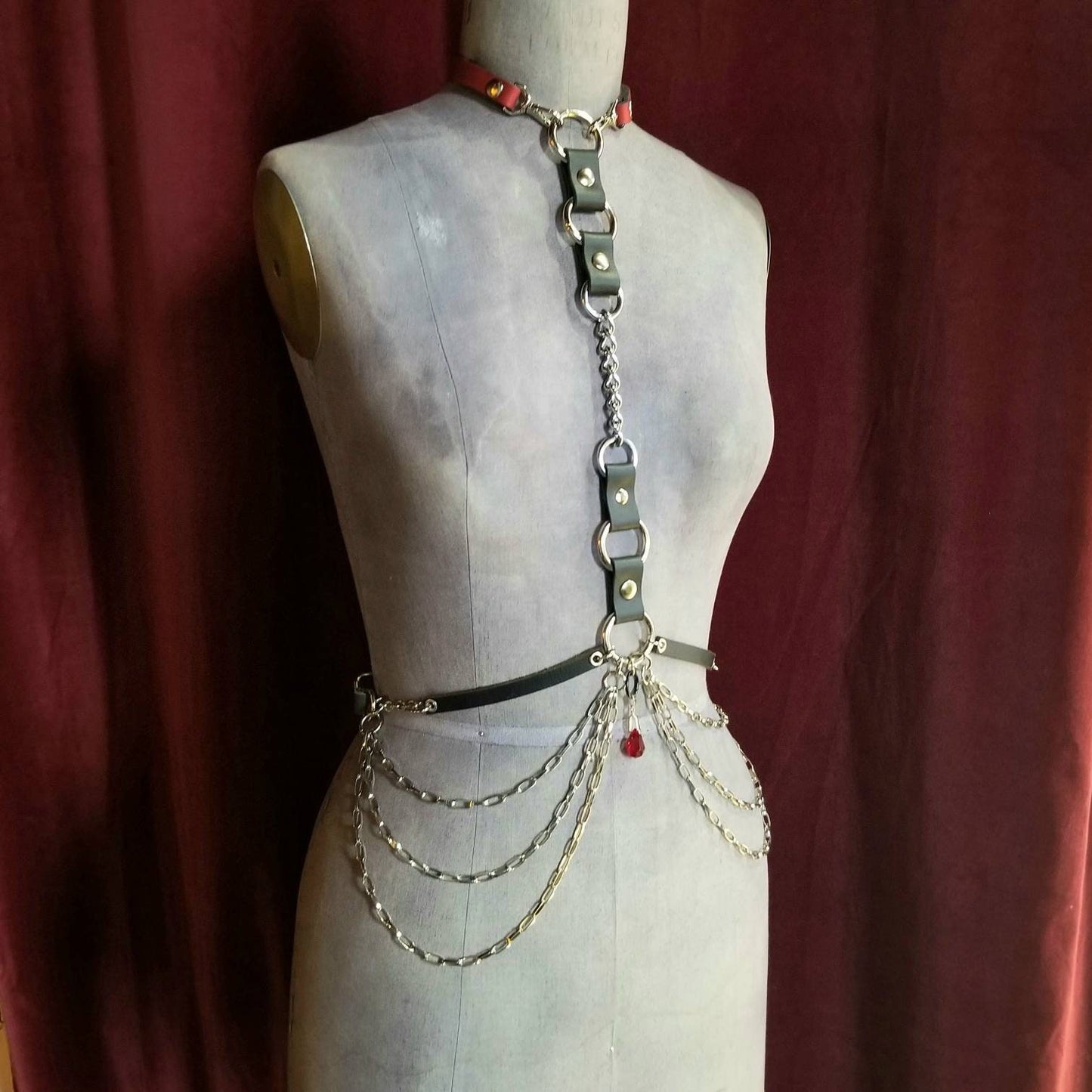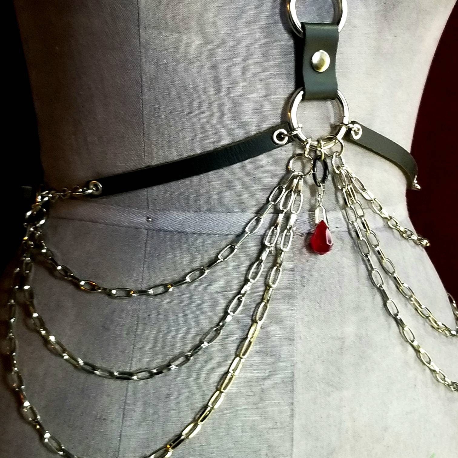 Midnight Ruby, draped Silver Chain and leather body harness. Custom made. Red crystal detail at navel. Brass orings, rivets, and multichains. Connect to an Adorned by Midnight choker with swivel snap.