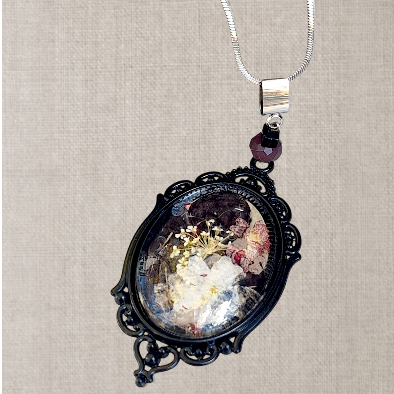 Goth witch vibes with real pressed flowers. A statement pendant both bold and witchy sweet.