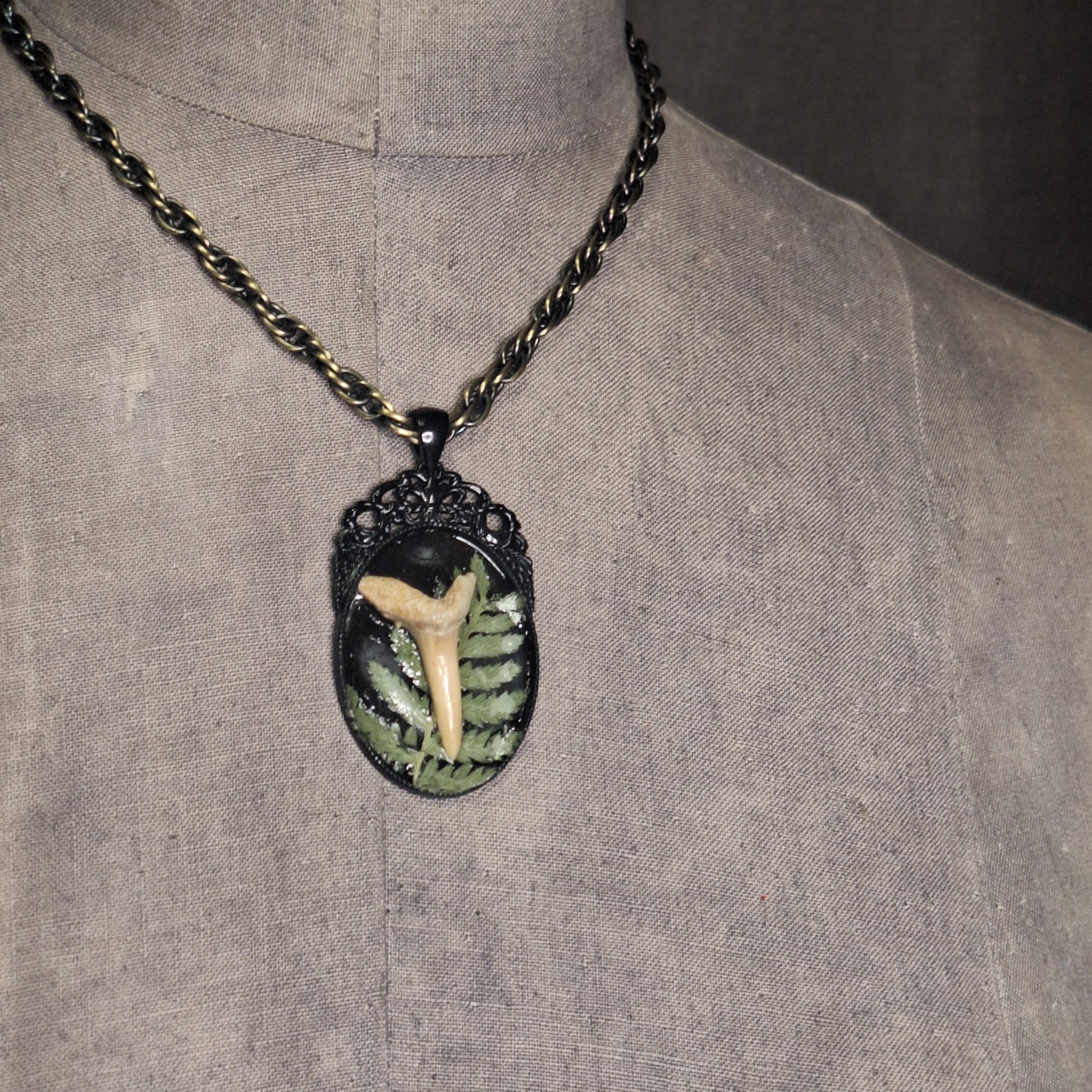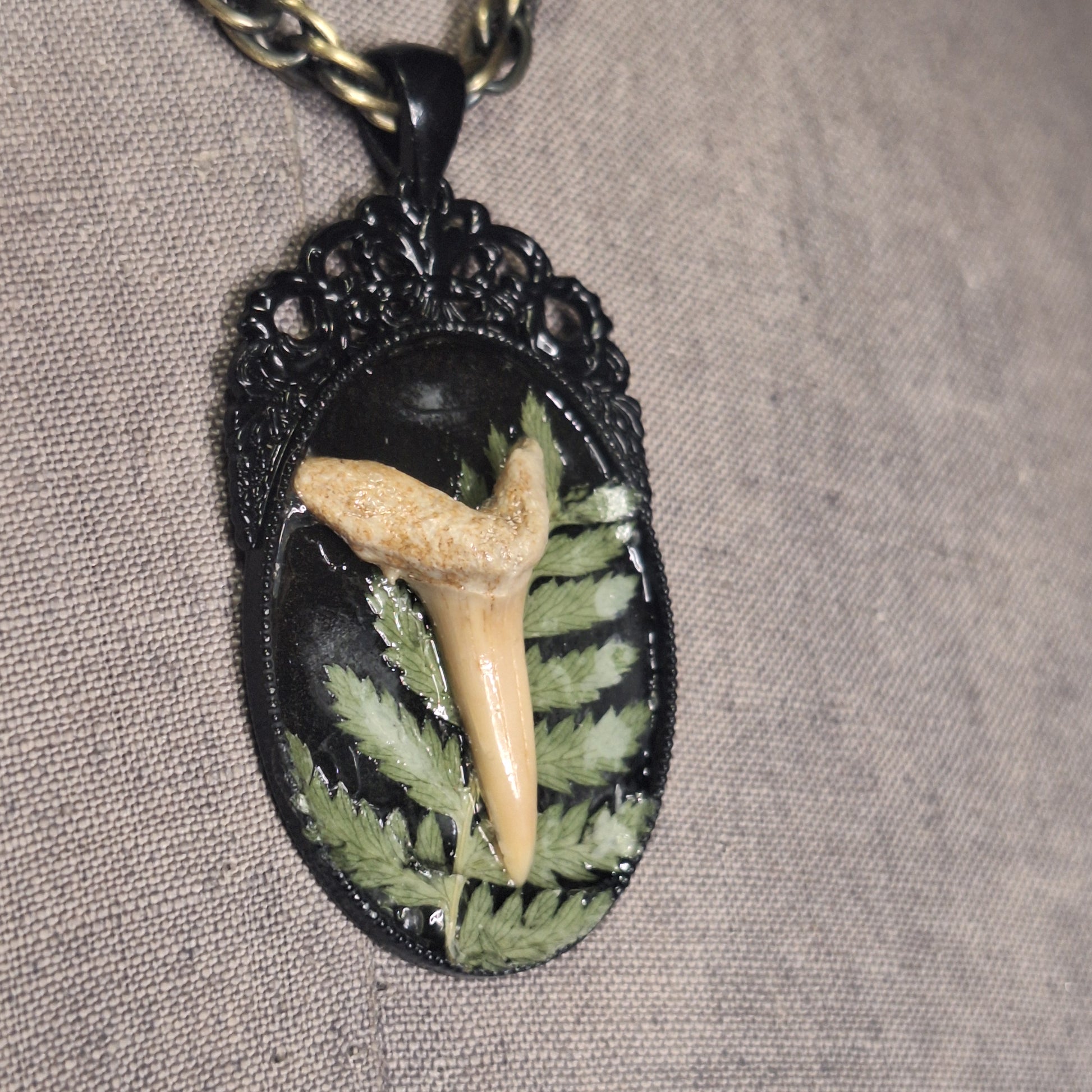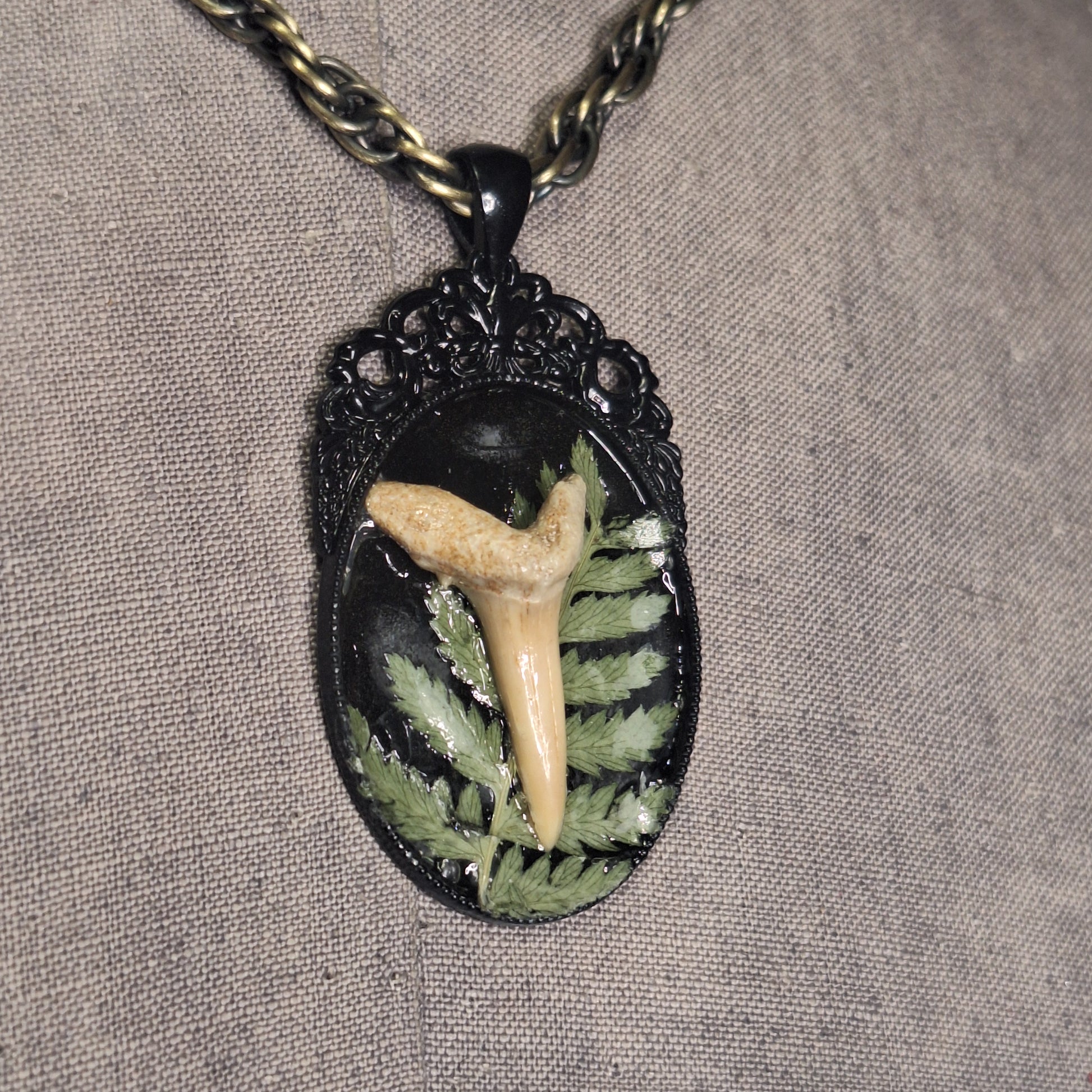 Embrace your inner Goth with this one-of-a-kind pendant necklace featuring a real shark tooth and green leaves. The antique chain adds a touch of history, while the black cameo pendant adds a touch of mystery. Perfect for adding a touch of vamp scientific vibes to your look of the day.