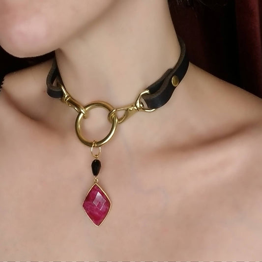 Cristal Vert 🖤 Green Amethyst & Black Leather Choker. Handmade.