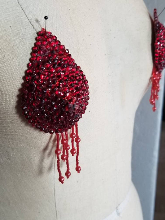 Chunky black geometric drop earrings with gold chain and purple bead detail.