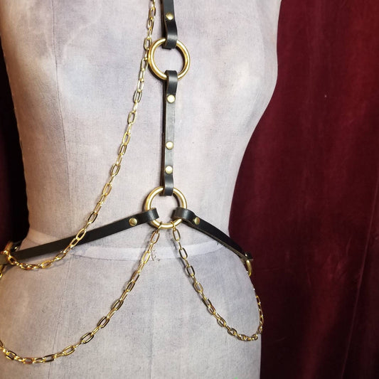 Mischief draped chain harness. * Silver chain and Black Leather body harness. Minimal. Versatile. Handmade. Attach to your choker with swivel snap.