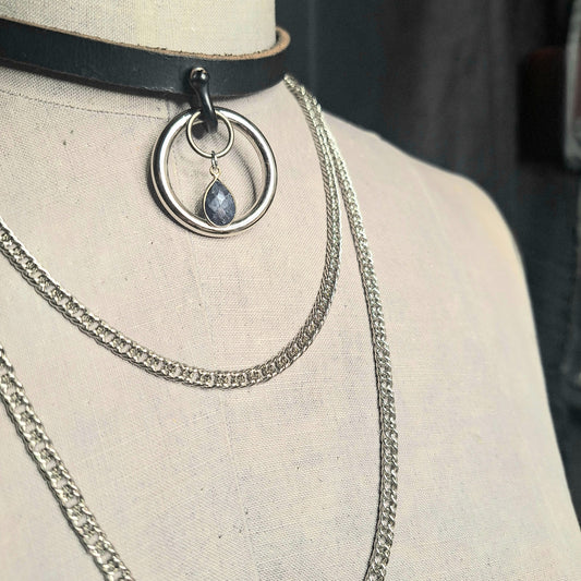 Layered,Draped Silver Chain, Sapphire, and Leather Choker. Chic Leather, 1" silver O-ring with teardrop stone. Handmade.