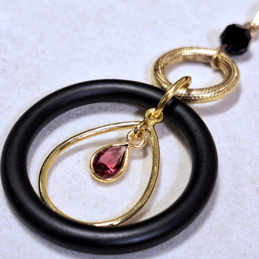 Chic Stone, Steel, & Silver oring collar. Black slender leather, 2" silver oring, & faceted Ruby teardrop.