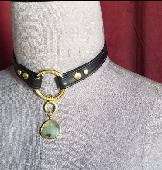 Labradorite gemstone and stitched leather collar. High-end goth lux statement piece.
