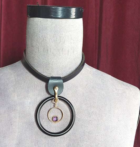 Athena Black Leather, Black Steel, & Gold ring with Amethyst Stone Detail. High end Materials. Handmade.
