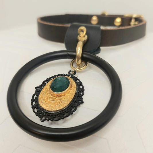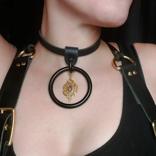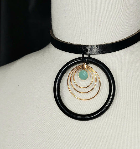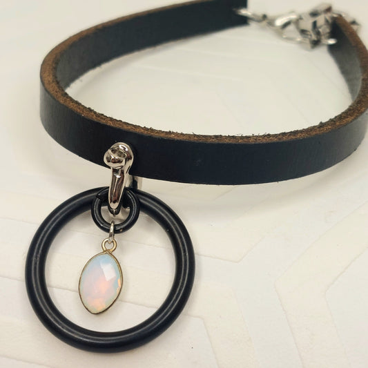 Eva Opal and Black O-ring Leather Day Collar. Handmade. Gemstone, Minimalist, Gothic style. Gift for her.