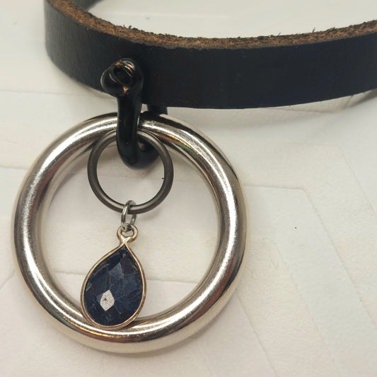Eva Sapphire. Chic Leather Necklace with Silver oring and Sapphire Teardrop. Handmade.