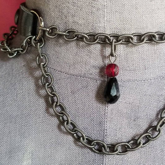 Midnight Ruby, draped Silver Chain and leather body harness. Custom made. Red crystal detail at navel. Brass orings, rivets, and multichains. Connect to an Adorned by Midnight choker with swivel snap.