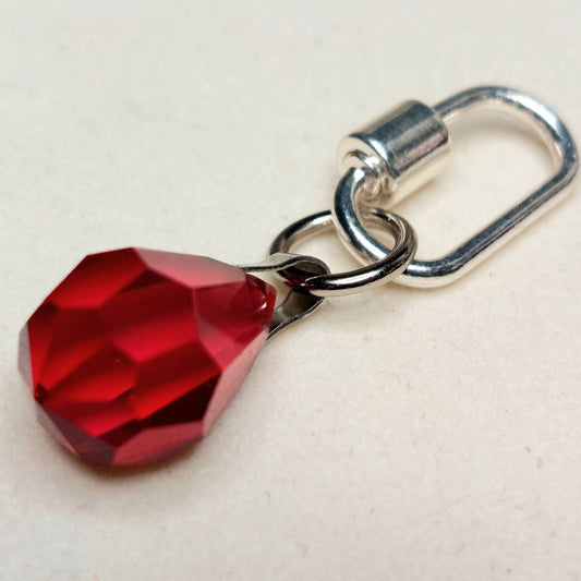 The Delena, red crystal teardrop, and black leather ribbon necklace. Leather is handwoven through silver orings with red teardrops.