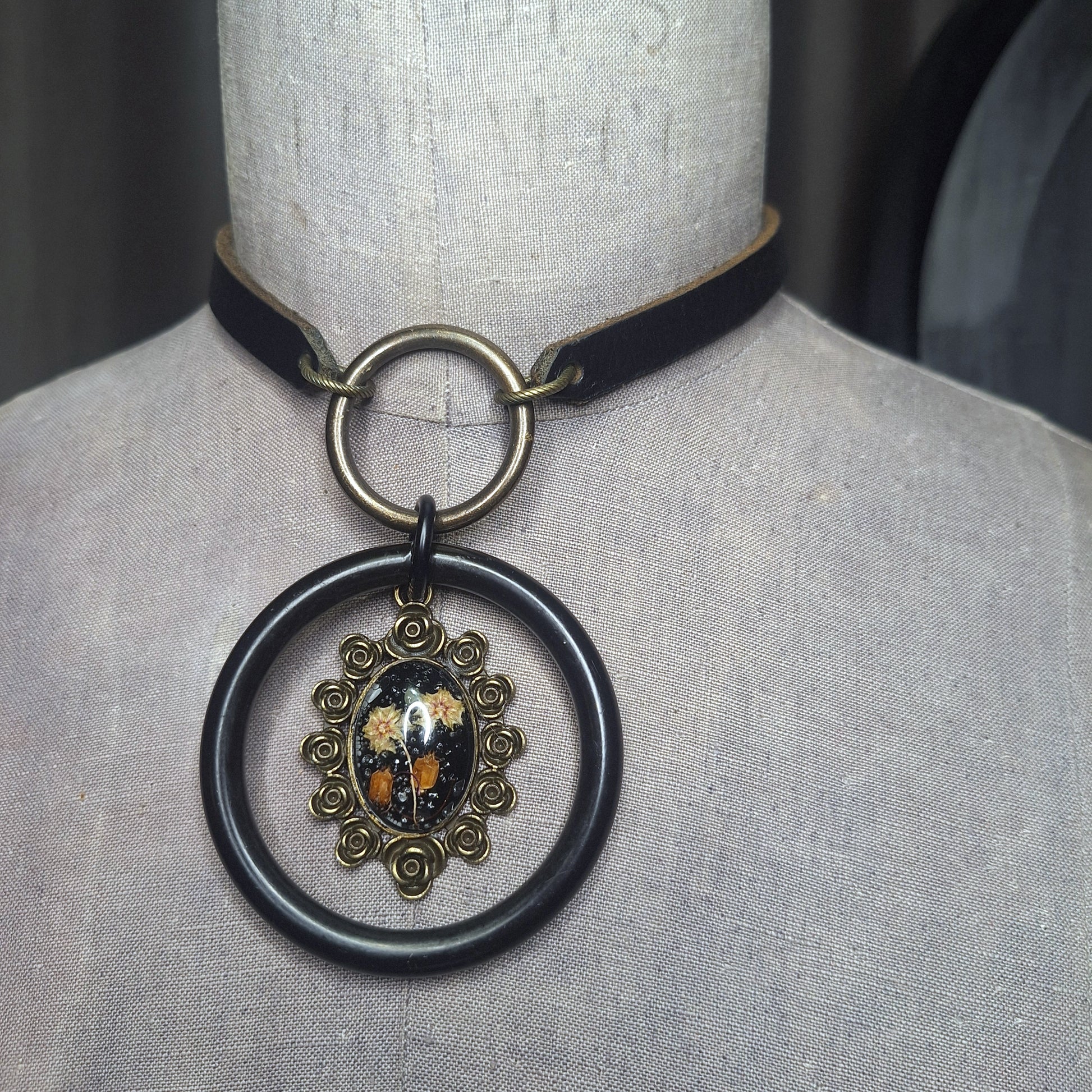 Handmade Leather Choker with a one-of-a-kind, antique brass flower framed pendant with real pressed flowers encased in resin.