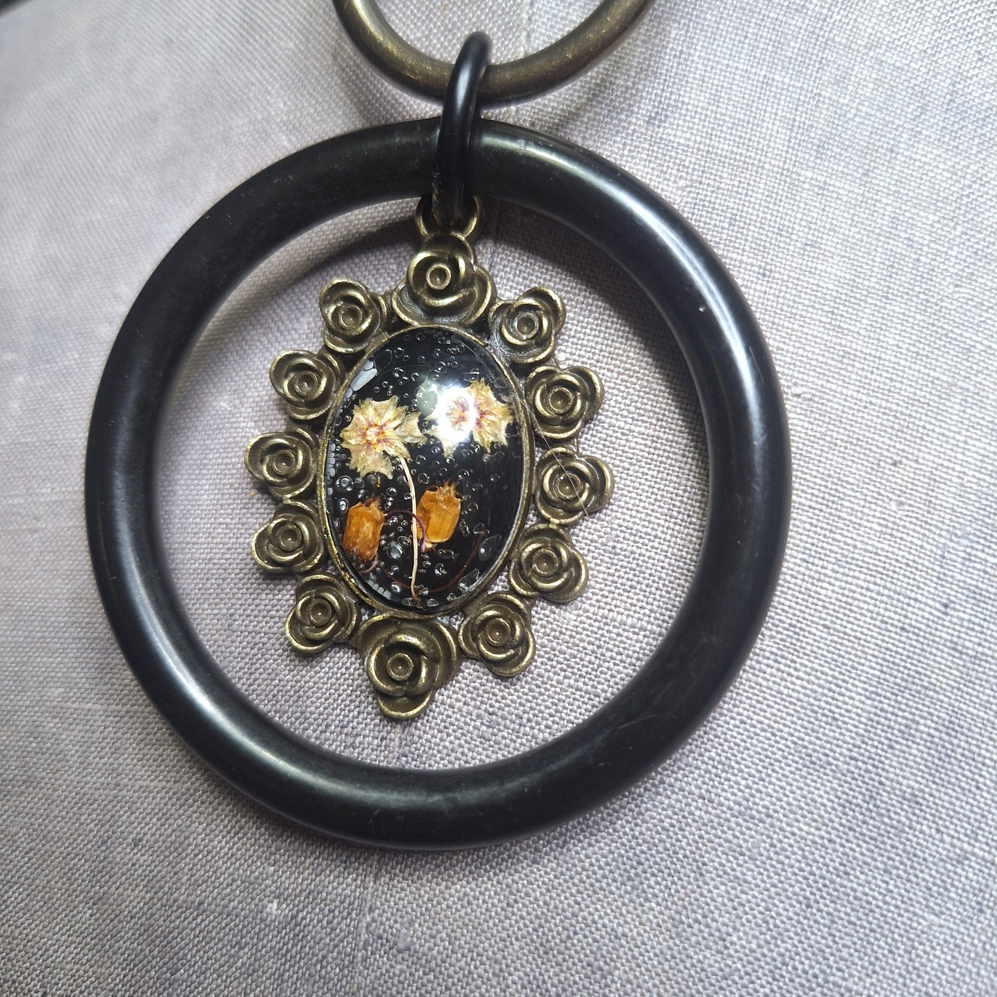 The flower charm is suspended within 2" black steel O-ring adornment, hanging from a 1" antique brass oring.