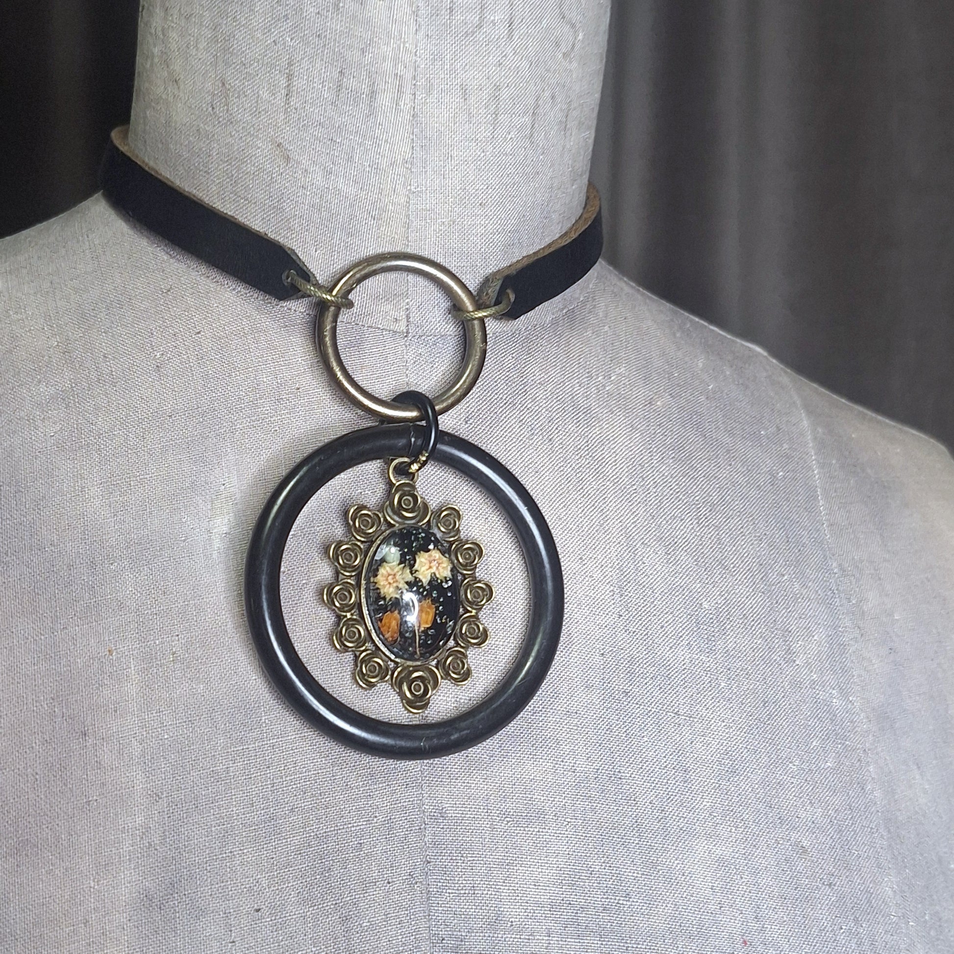 Season of the Witch, Double Oring Choker with Dried Pressed Flowers Adornment Centerpiece.