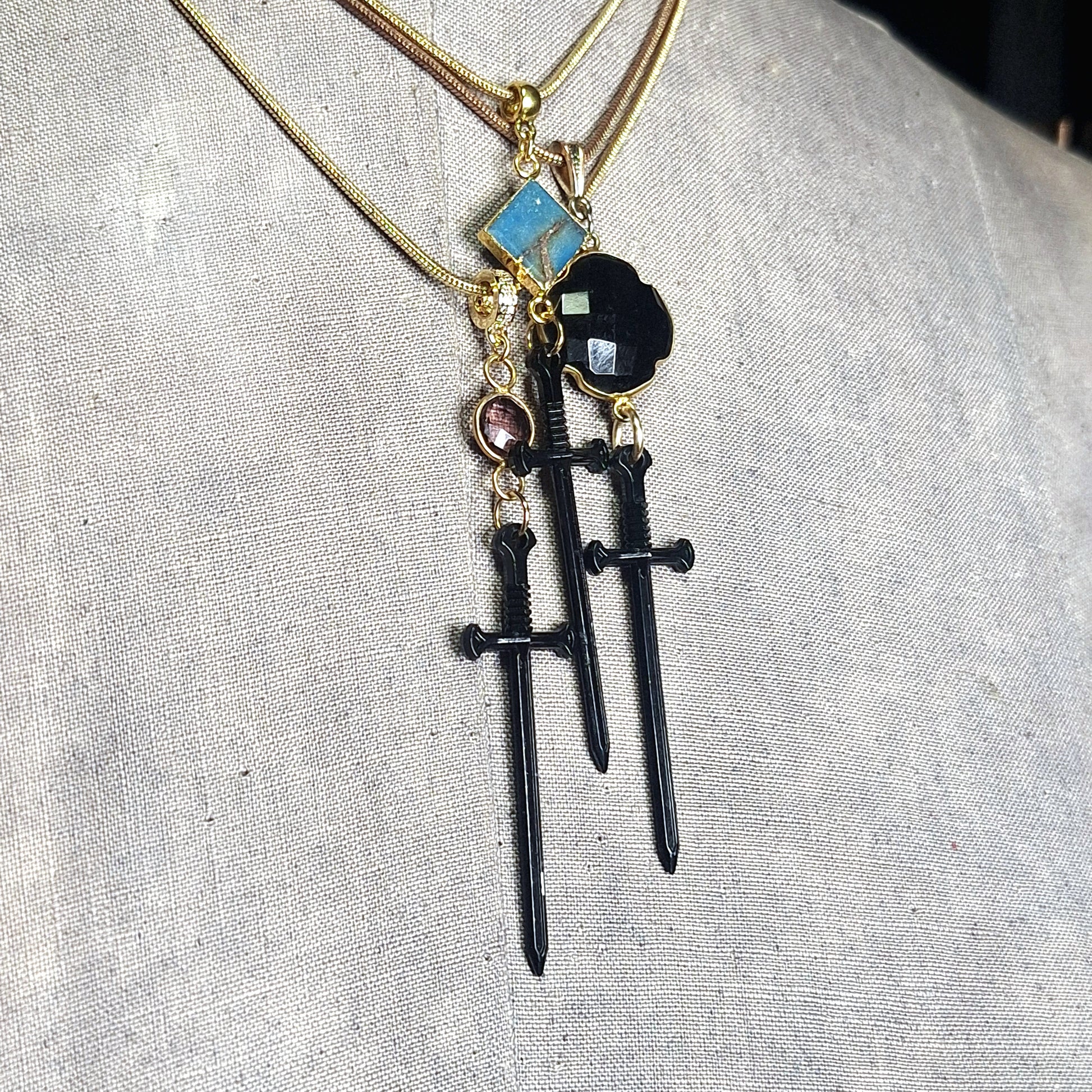 Black sword with amethyst stone on gold chain.