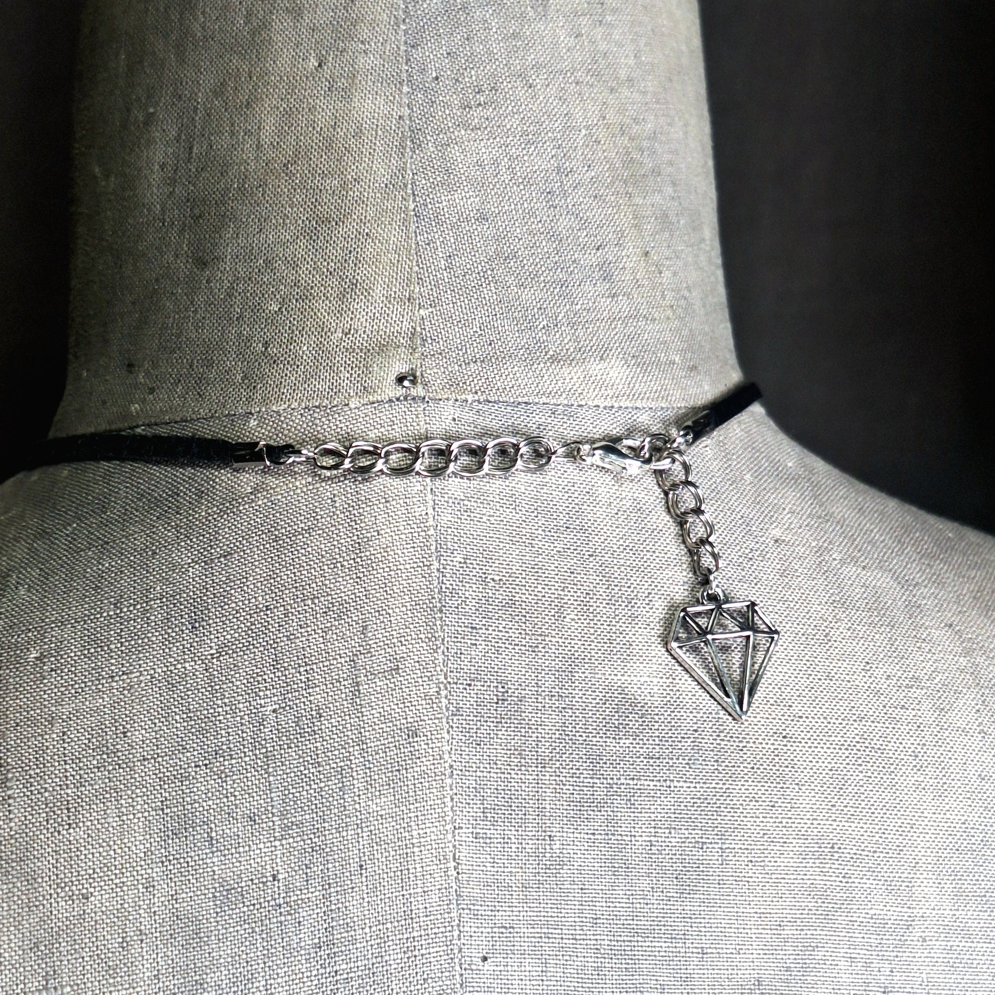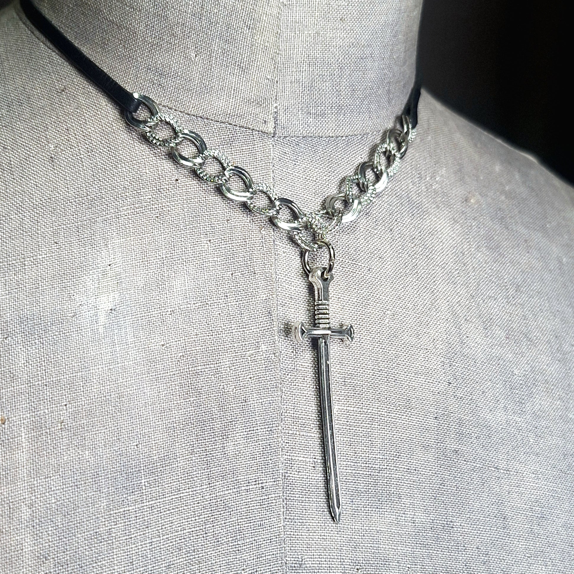Silver sword and silver chain with black leather ribbon.