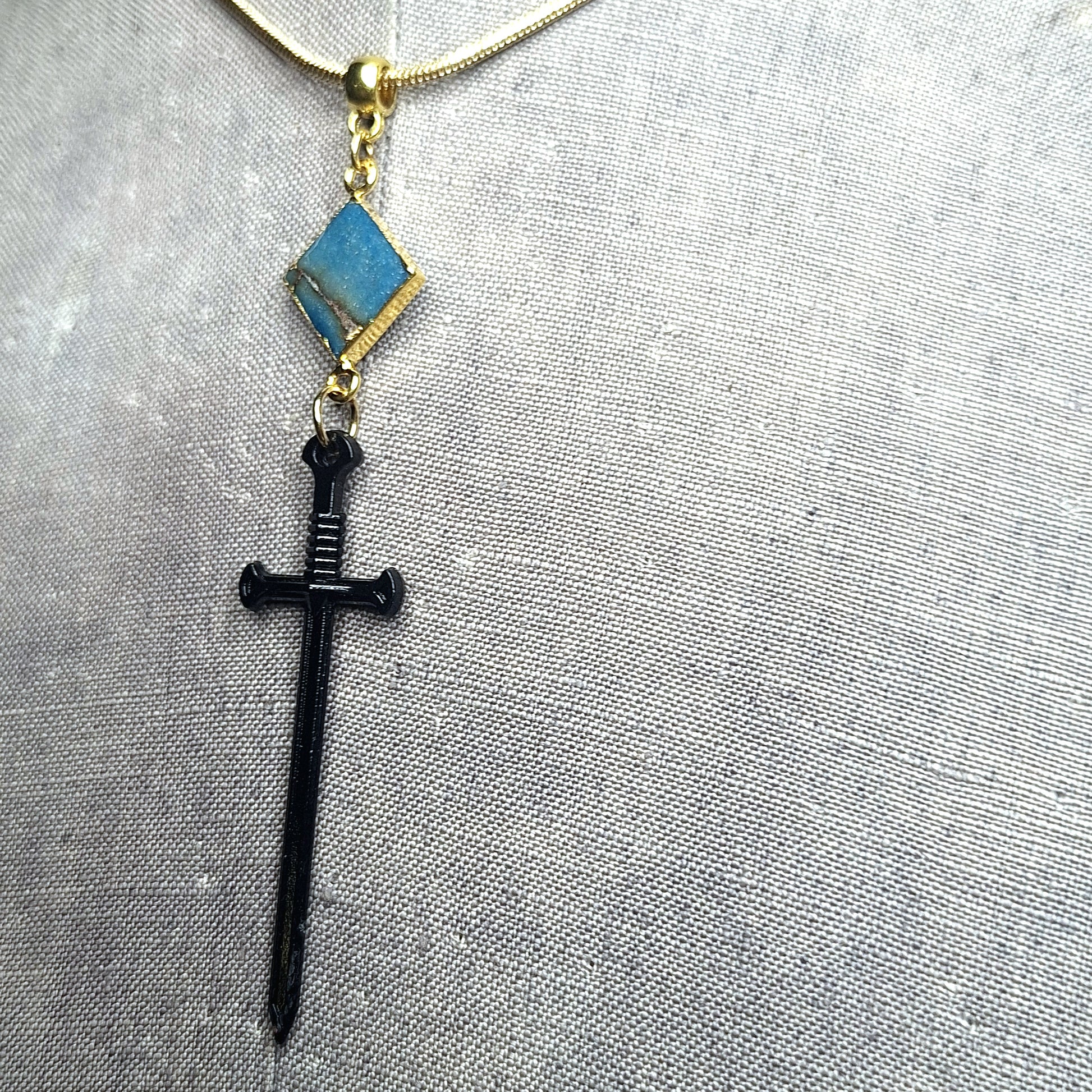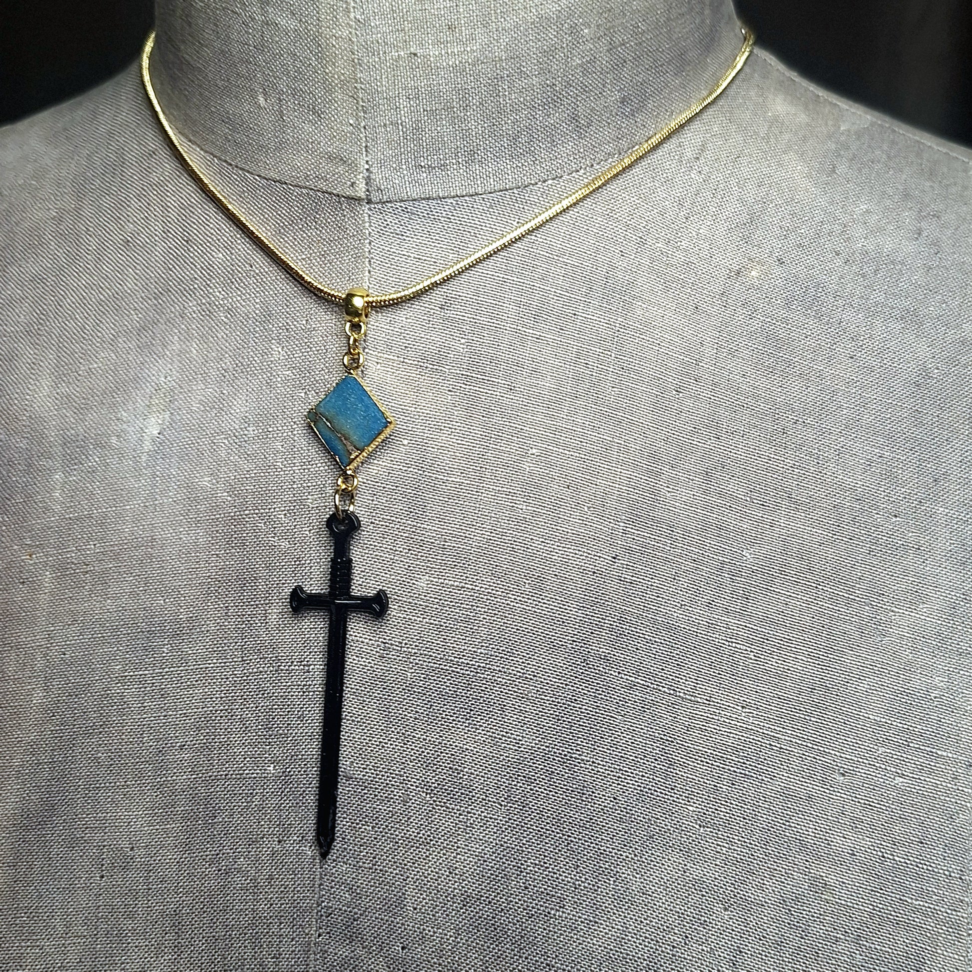 Gold sword with turquoise stone on gold chain.